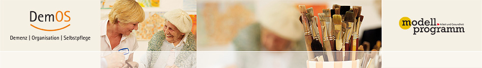 Medienmappe DemOSDen Alltag gestalten![]() Praktische Hilfestellungen für die Pflege von Menschen mit DemenzDiese Broschüre kann kostenfrei bestellt werden bei der Initiative Neue Qualität der Arbeit (INQA) Bestellmöglichkeit unter: Kurzfilme aus der ProjektarbeitDemOS: Demenz - Organisation - Selbstpflege:8 Kurzfilme: Gute Praxis in der Altenpflege Zukunft Demenz![]() Die Versorgung von Menschen mit Demenz wird in den kommenden Jahren zu einem der drängendsten Probleme. Mit einem Anteil von 60-70% demenziell veränderter PflegeheimbewohnerInnen ist die Pflege alter Menschen schon jetzt überwiegend Demenzpflege. Diese stellt zum einen eine hoch anspruchsvolle Aufgabe dar. Zum anderen unterscheidet sich die Pflege von Menschen mit Demenz markant von pflegerischen Tätigkeiten für andere Gruppen. Und nicht zuletzt rückt sie die Frage nach der "Pflege der Pflegenden" ins Zentrum der Aufmerksamkeit. |